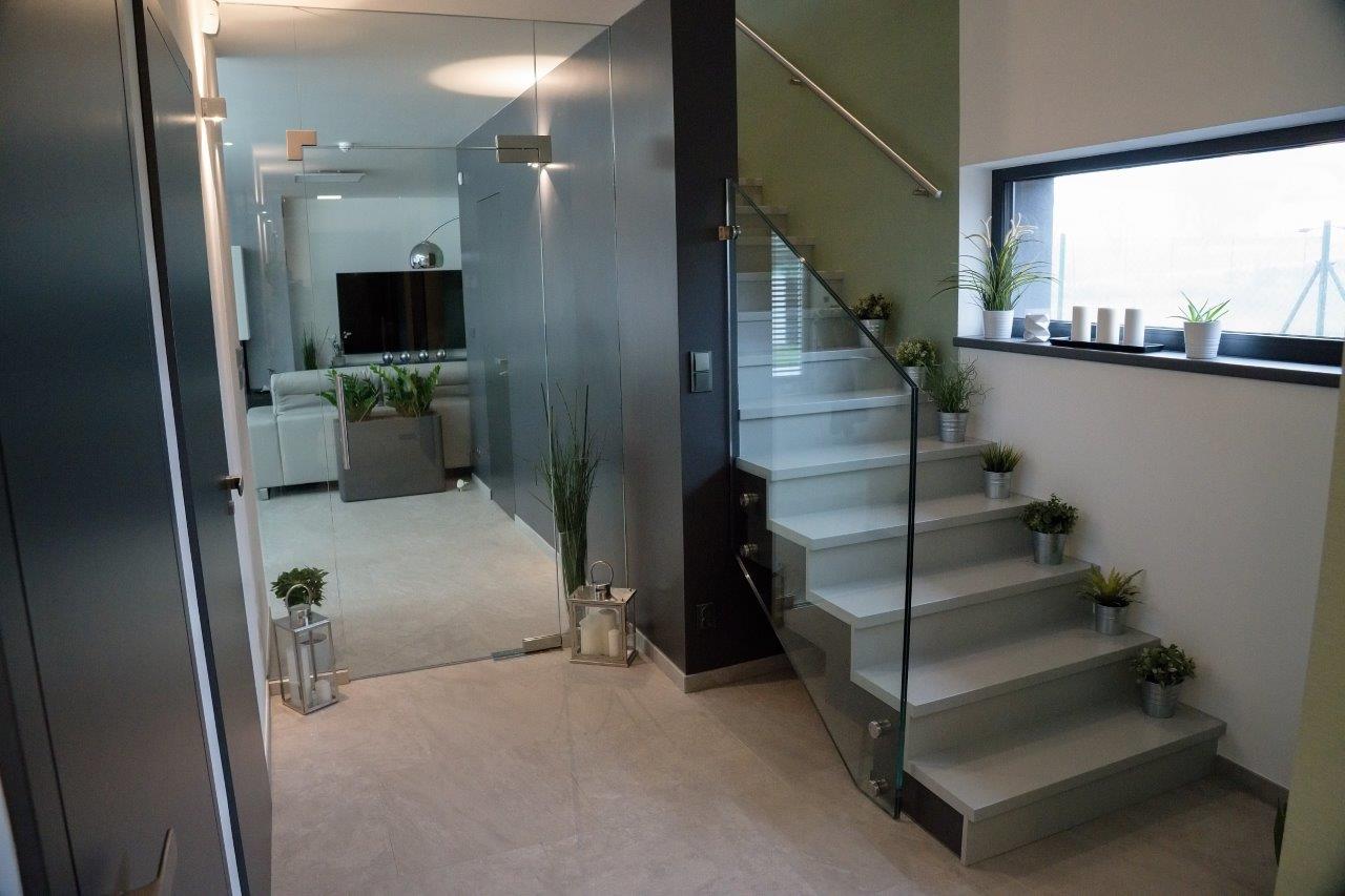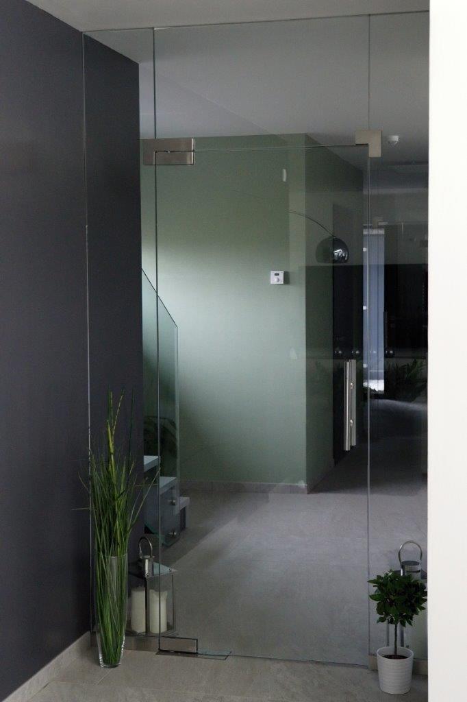 Navrhujeme a realizujeme prosklené stěny, kde je sklo uchyceno v rámech, nebo je sklo včetně dveří uchyceno pomocí lišt a úchytek, používáme kování DORMA.